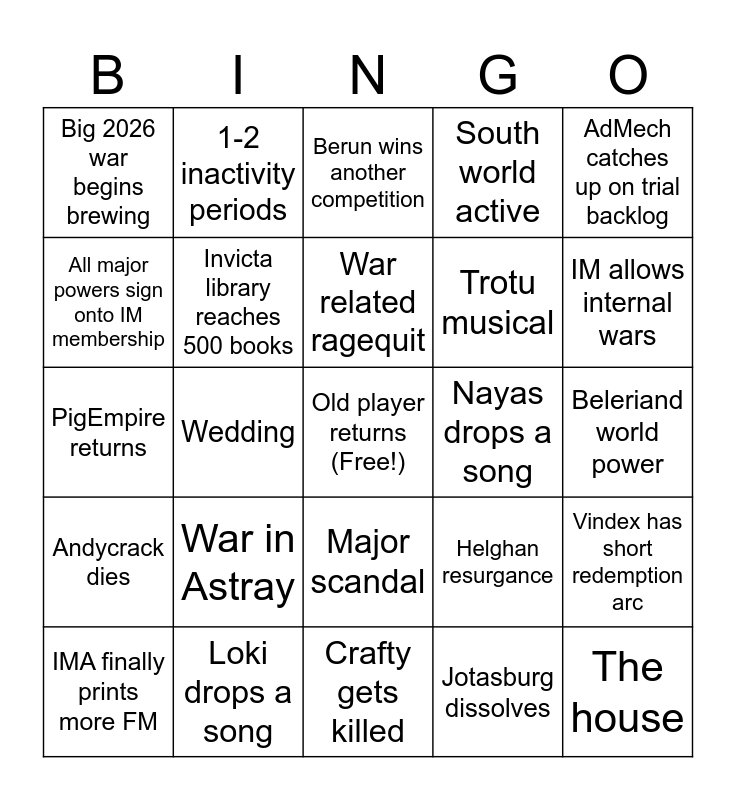 This bingo card has a free space and 24 words: War in Astray, Loki drops a song, War related ragequit, IMA finally prints more FM, AdMech catches up on trial backlog, Big 2026 war begins brewing, All major powers sign onto IM membership, 1-2 inactivity periods, Nayas drops a song, Major scandal, Trotu musical, PigEmpire returns, Helghan resurgance, Vindex has short redemption arc, Invicta library reaches 500 books, Jotasburg dissolves, Beleriand world power, Berun wins another competition, IM allows internal wars, Wedding, The house, Andycrack dies, South world active and Crafty gets killed.