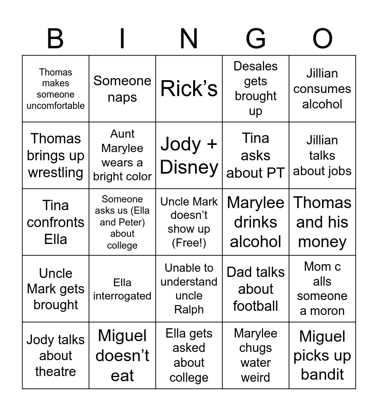 This bingo card has a free space and 24 words: Ella interrogated, Miguel doesn’t eat, Jody + Disney, Jody talks about theatre, Jillian consumes alcohol, Thomas makes someone uncomfortable, Thomas brings up wrestling, Someone naps, Marylee drinks alcohol, Unable to understand uncle Ralph, Tina asks about PT, Tina confronts Ella, Dad talks about football, Mom calls someone a moron, Aunt Marylee wears a bright color, Marylee chugs water weird, Thomas and his money, Rick’s, Jillian talks about jobs, Someone asks us (Ella and Peter) about college, Miguel picks up bandit, Uncle Mark gets brought, Desales gets brought up and Ella gets asked about college.