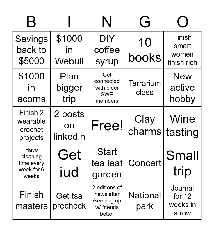 This bingo card has a free space and 24 words: Get iud, Get tsa precheck, Get connected with older SWE members, Finish masters, Finish smart women finish rich, Savings back to $5000, $1000 in acorns, $1000 in Webull, Clay charms, Start tea leaf garden, Terrarium class, Finish 2 wearable crochet projects, Concert, Small trip, Plan bigger trip, National park, Wine tasting, DIY coffee syrup, New active hobby, 2 posts on linkedin, Journal for 12 weeks in a row, Have cleaning time every week for 6 weeks, 10 books and 2 editions of newsletter /keeping up w/ friends better.