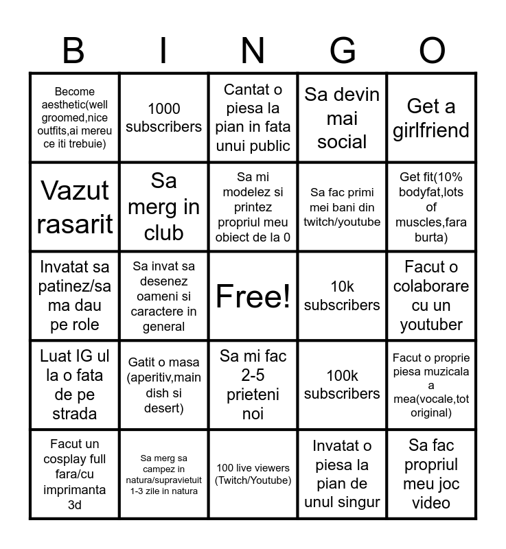 This bingo card has a free space and 24 words: Gatit o masa (aperitiv,main dish si desert), Sa merg sa campez in natura/supravietuit 1-3 zile in natura, Sa mi modelez si printez propriul meu obiect de la 0, Facut un cosplay full fara/cu imprimanta 3d, Get a girlfriend, Become aesthetic(well groomed,nice outfits,ai mereu ce iti trebuie), Vazut rasarit, 1000 subscribers, 10k subscribers, Sa mi fac 2-5 prieteni noi, Sa fac primi mei bani din twitch/youtube, Invatat sa patinez/sa ma dau pe role, 100k subscribers, Facut o proprie piesa muzicala a mea(vocale,tot original), Sa merg in club, Invatat o piesa la pian de unul singur, Facut o colaborare cu un youtuber, Cantat o piesa la pian in fata unui public, Get fit(10% bodyfat,lots of muscles,fara burta), Sa invat sa desenez oameni si caractere in general, Sa fac propriul meu joc video, Luat IG ul la o fata de pe strada, Sa devin mai social and 100 live viewers (Twitch/Youtube).