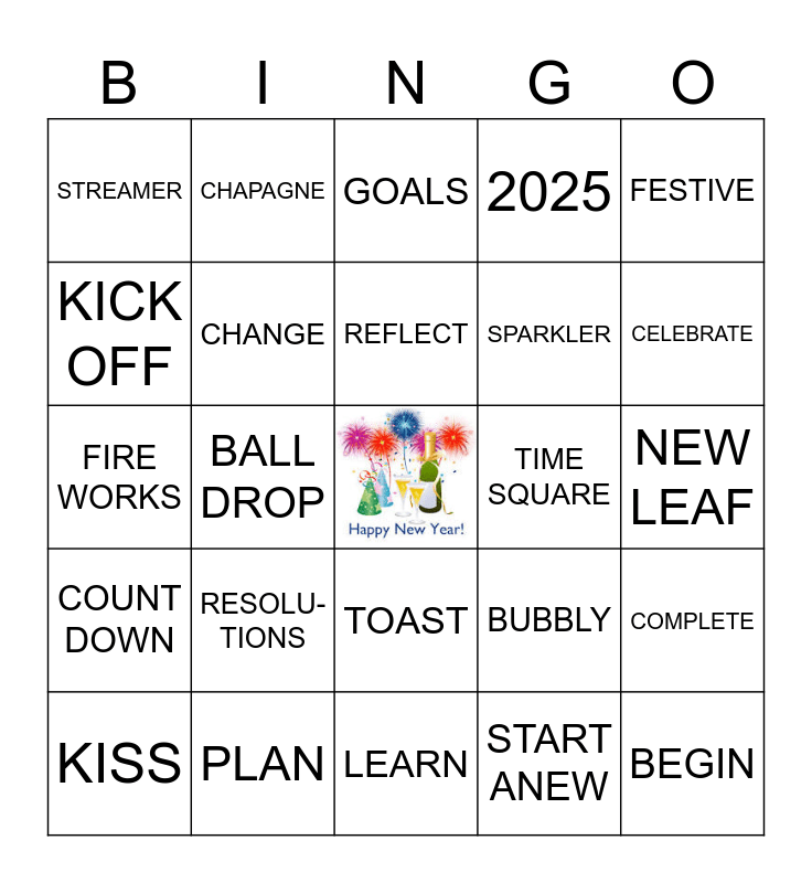 This bingo card has a free space and 29 words: KISS, SNAKE, BALL DROP, HOPEFUL, STREAMER, GOALS, CHANGE, RESOLU-TIONS, TIME SQUARE, PLAN, NEW LEAF, BEGIN, LEARN, START ANEW, CELEBRATE, 12 GRAPES, TOAST, COUNT DOWN, FESTIVE, FIRE WORKS, BUBBLY, CONFETTI, SPARKLER, KICK OFF, 2025, CHAPAGNE, COMPLETE, REFLECT and CHEERS.