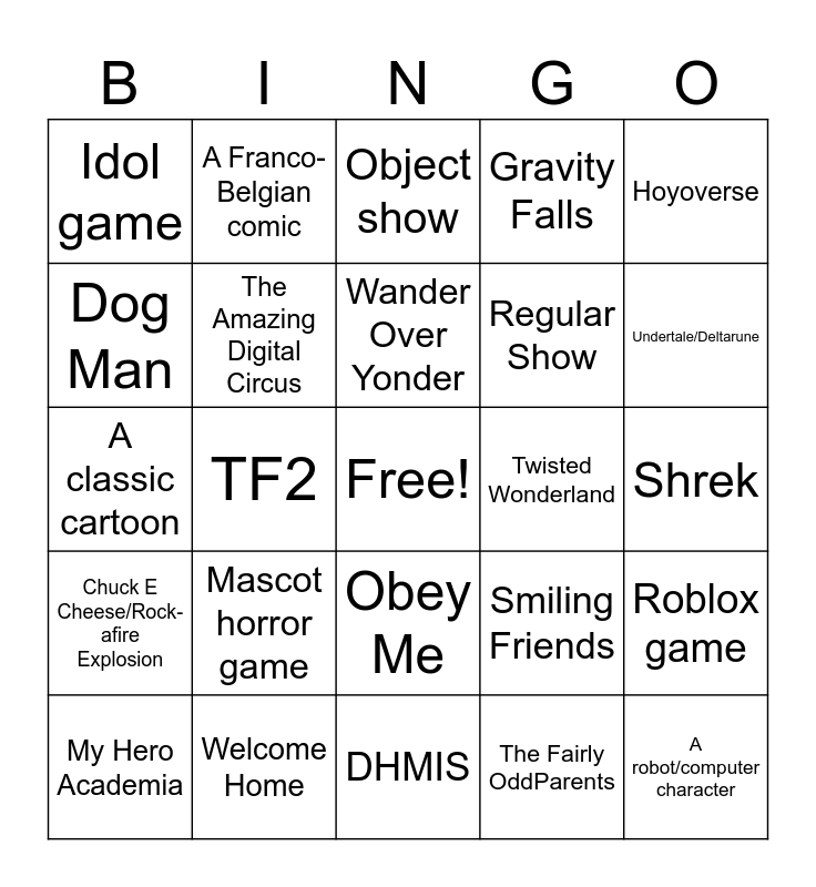 This bingo card has a free space and 24 words: Mascot horror game, Welcome Home, Wander Over Yonder, My Hero Academia, Hoyoverse, Idol game, Dog Man, A Franco-Belgian comic, Twisted Wonderland, Obey Me, Regular Show, A classic cartoon, Smiling Friends, Roblox game, The Amazing Digital Circus, The Fairly OddParents, Shrek, Object show, Undertale/Deltarune, TF2, A robot/computer character, Chuck E Cheese/Rock-afire Explosion, Gravity Falls and DHMIS.