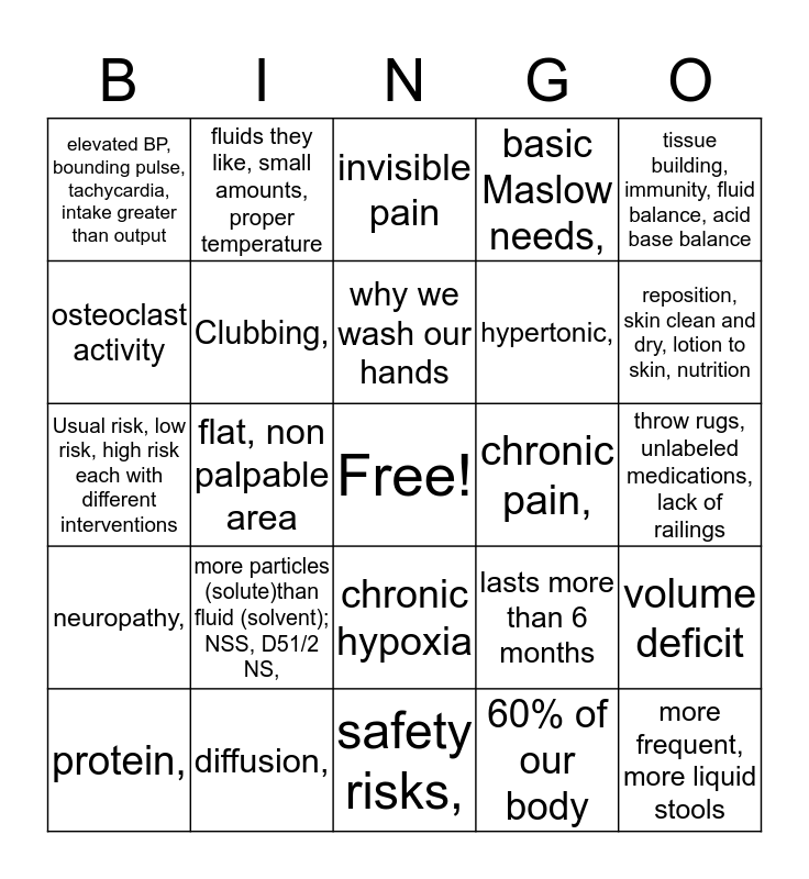 This bingo card has a free space and 42 words: Chvostek, Trousseau, cheese, sardines, dark leafy vegetables, soybeans, OJ fortified, why we wash our hands, dizziness upon standing, more particles (solute)than fluid (solvent); NSS, D51/2 NS,, 60% of our body, volume deficit, more frequent, more liquid stools, tenderness, warmth, calf edema, invisible pain, chronic hypoxia, throw rugs, unlabeled medications, lack of railings, reposition, skin clean and dry, lotion to skin, nutrition, flat, non palpable area, tissue building, immunity, fluid balance, acid base balance, passive movement of particles from higher to lower concentration, lasts more than 6 months, non slip footware, signage, call bell within reach, Usual risk, low risk, high risk each with different interventions, food, shelter, security, fluids they like, small amounts, proper temperature, osteoclast activity, nutrients absorption highest here, sodium level 150, elevated BP, bounding pulse, tachycardia, intake greater than output, hypocalcemia,, infection prevention,, hypertonic,, water volume (amount),, more output than intake,, diarrhea,, DVT,, neuropathy,, Clubbing,, safety risks,, macule,, protein,, diffusion,, chronic pain,, non malfecience,, Morse Fall scale,, basic Maslow needs, and bone breakdown.
