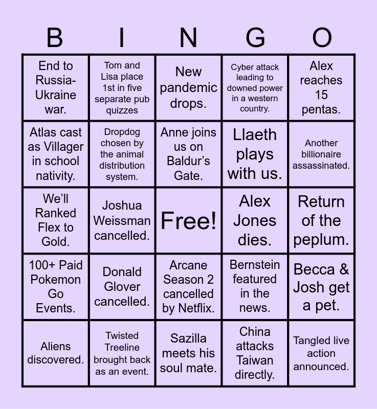 This bingo card has a free space and 24 words: Donald Glover cancelled., Twisted Treeline brought back as an event., Anne joins us on Baldur’s Gate., Aliens discovered., Alex reaches 15 pentas., End to Russia-Ukraine war., Atlas cast as Villager in school nativity., Tom and Lisa place 1st in five separate pub quizzes, Alex Jones dies., Arcane Season 2 cancelled by Netflix., Llaeth plays with us., We’ll Ranked Flex to Gold., Bernstein featured in the news., Becca & Josh get a pet., Dropdog chosen by the animal distribution system., China attacks Taiwan directly., Return of the peplum., New pandemic drops., Another billionaire assassinated., Joshua Weissman cancelled., Tangled live action announced., 100+ Paid Pokemon Go Events., Cyber attack leading to downed power in a western country. and Sazilla meets his soul mate..