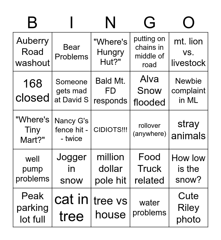 This bingo card has a free space and 24 words: Jogger in snow, cat in tree, Bald Mt. FD responds, Peak parking lot full, mt. lion vs. livestock, Auberry Road washout, 168 closed, Bear Problems, rollover (anywhere), million dollar pole hit, Alva Snow flooded, "Where's Tiny Mart?", Food Truck related, How low is the snow?, Someone gets mad at David S, water problems, stray animals, "Where's Hungry Hut?", Newbie complaint in ML, Nancy G's fence hit -- twice, Cute Riley photo, well pump problems, putting on chains in middle of road and tree vs house.