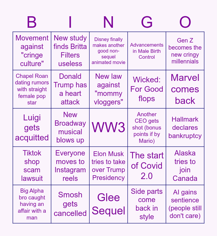 This bingo card has a free space and 24 words: Everyone moves to Instagram reels, Smosh gets cancelled, New law against "mommy vloggers", Big Alpha bro caught having an affair with a man, Gen Z becomes the new cringy millennials, Movement against "cringe culture", Chapel Roan dating rumors with straight female pop star, New study finds Britta Filters useless, Another CEO gets shot (bonus points if by Mario), Elon Musk tries to take over Trump Presidency, Wicked: For Good flops, Luigi gets acquitted, The start of Covid 2.0, Alaska tries to join Canada, Donald Trump has a heart attack, Side parts come back in style, Hallmark declares bankruptcy, Disney finally makes another good non-sequel animated movie, Marvel comes back, New Broadway musical blows up, AI gains sentience (people still don't care), Tiktok shop scam lawsuit, Advancements in Male Birth Control and Glee Sequel.