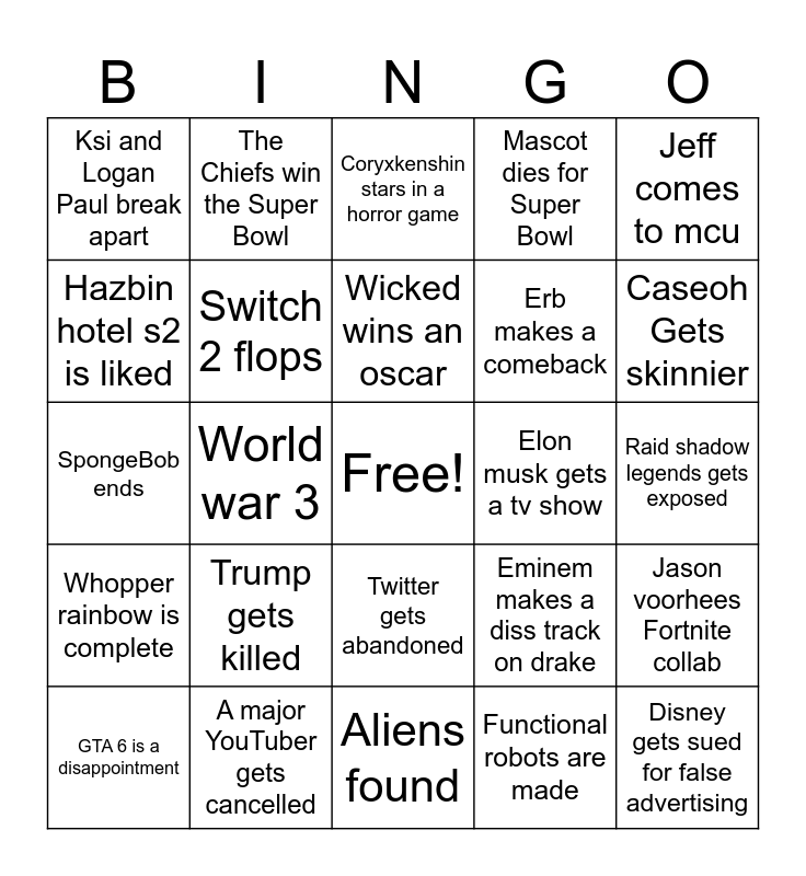 This bingo card has a free space and 24 words: Trump gets killed, A major YouTuber gets cancelled, Wicked wins an oscar, GTA 6 is a disappointment, Jeff comes to mcu, Ksi and Logan Paul break apart, Hazbin hotel s2 is liked, The Chiefs win the Super Bowl, Elon musk gets a tv show, Twitter gets abandoned, Erb makes a comeback, SpongeBob ends, Eminem makes a diss track on drake, Jason voorhees Fortnite collab, Switch 2 flops, Functional robots are made, Raid shadow legends gets exposed, Coryxkenshin stars in a horror game, Caseoh Gets skinnier, World war 3, Disney gets sued for false advertising, Whopper rainbow is complete, Mascot dies for Super Bowl and Aliens found.
