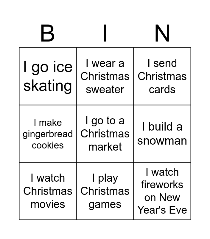 This bingo card has 9 words: I watch Christmas movies, I send Christmas cards, I wear a Christmas sweater, I make gingerbread cookies, I go ice skating, I build a snowman, I go to a Christmas market, I watch fireworks on New Year's Eve and I play Christmas games.