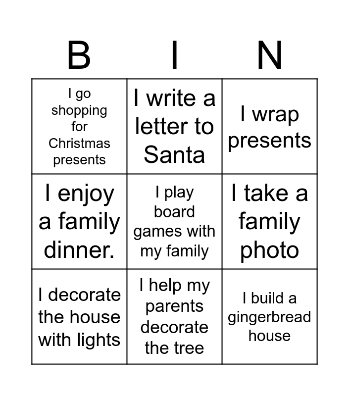 This bingo card has 9 words: I decorate the house with lights, I wrap presents, I write a letter to Santa, I enjoy a family dinner., I go shopping for Christmas presents, I take a family photo, I play board games with my family, I build a gingerbread house and I help my parents decorate the tree.
