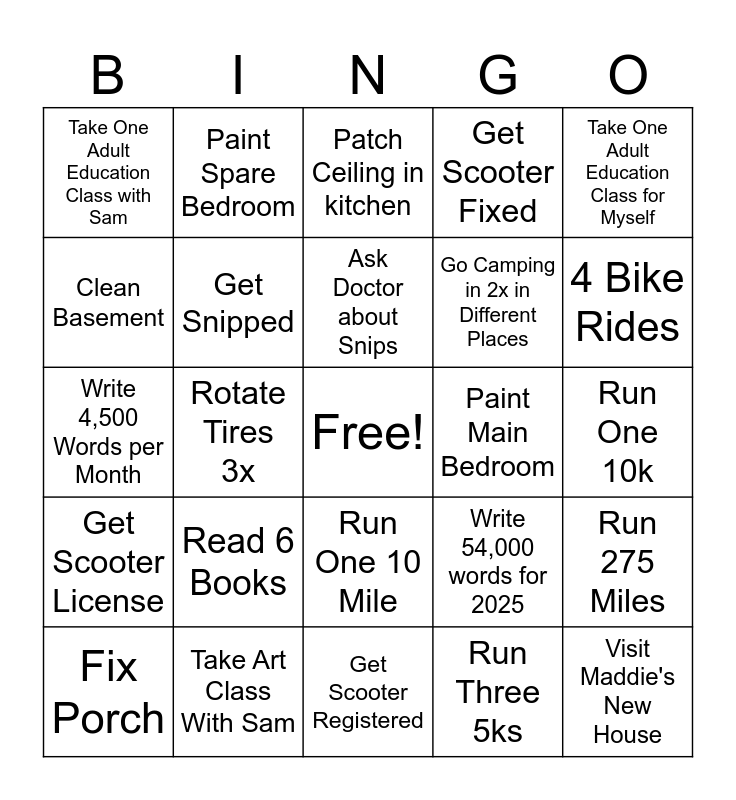 This bingo card has a free space and 24 words: Read 6 Books, Take Art Class With Sam, Ask Doctor about Snips, Fix Porch, Take One Adult Education Class for Myself, Take One Adult Education Class with Sam, Clean Basement, Paint Spare Bedroom, Paint Main Bedroom, Run One 10 Mile, Go Camping in 2x in Different Places, Write 4,500 Words per Month, Write 54,000 words for 2025, Run 275 Miles, Get Snipped, Run Three 5ks, Run One 10k, Patch Ceiling in kitchen, 4 Bike Rides, Rotate Tires 3x, Visit Maddie's New House, Get Scooter License, Get Scooter Fixed and Get Scooter Registered.