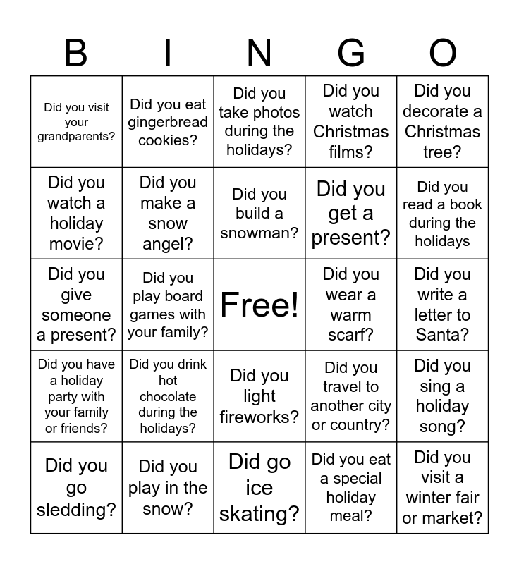 This bingo card has a free space and 24 words: Did you drink hot chocolate during the holidays?, Did you play in the snow?, Did you build a snowman?, Did you go sledding?, Did you decorate a Christmas tree?, Did you visit your grandparents?, Did you watch a holiday movie?, Did you eat gingerbread cookies?, Did you wear a warm scarf?, Did you light fireworks?, Did you get a present?, Did you give someone a present?, Did you travel to another city or country?, Did you sing a holiday song?, Did you make a snow angel?, Did you eat a special holiday meal?, Did you write a letter to Santa?, Did you take photos during the holidays?, Did you read a book during the holidays, Did you play board games with your family?, Did you visit a winter fair or market?, Did you have a holiday party with your family or friends?, Did you watch Christmas films? and Did go ice skating?.