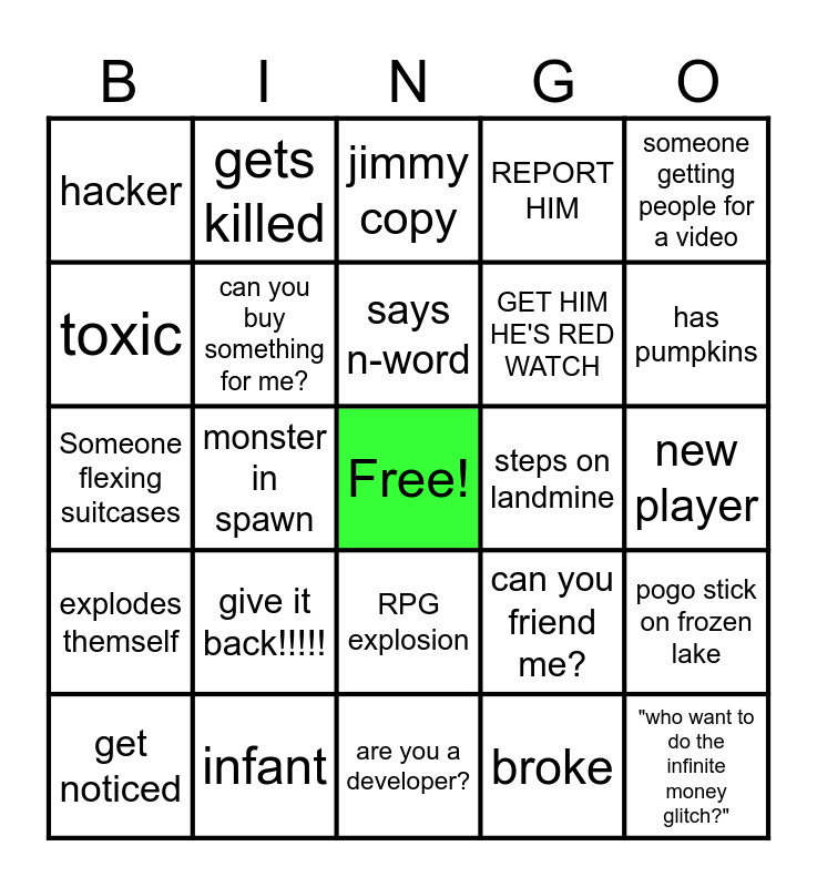 This bingo card has a free space and 24 words: give it back!!!!!, infant, says n-word, get noticed, someone getting people for a video, hacker, toxic, gets killed, steps on landmine, RPG explosion, GET HIM HE'S RED WATCH, Someone flexing suitcases, can you friend me?, pogo stick on frozen lake, can you buy something for me?, broke, new player, jimmy copy, has pumpkins, monster in spawn, "who want to do the infinite money glitch?", explodes themself, REPORT HIM and are you a developer?.
