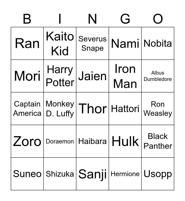 This bingo card has a free space and 24 words: Doraemon, Shizuka, Jaien, Suneo, Nobita, Ran, Mori, Kaito Kid, Hattori, Haibara, Iron Man, Captain America, Hulk, Black Panther, Harry Potter, Hermione, Ron Weasley, Severus Snape, Albus Dumbledore, Monkey D. Luffy, Usopp, Zoro, Nami and Sanji.