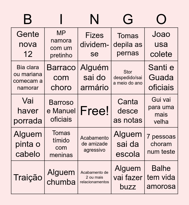 This bingo card has a free space and 24 words: Tomas tímido com meninas, Alguem chumba, Alguém sai do armário, Traição, Joao usa colete, Gente nova 12, Bia clara ou mariana comecam a namorar, MP namora com um pretinho, Canta desce as notas, Acabamento de amizade agressivo, Stor despedido/sai a meio do ano, Vai haver porrada, Alguem sai da escola, 7 pessoas choram num teste, Barraco com choro, Alguem vai fazer buzz, Gui vai para uma mais velha, Fizes dividem-se, Santi e Guada oficiais, Barroso e Manuel oficiais, Balhe tem vida amorosa, Alguem pinta o cabelo, Tomas depila as pernas and Acabamento de 2 ou mais relacionamentos.