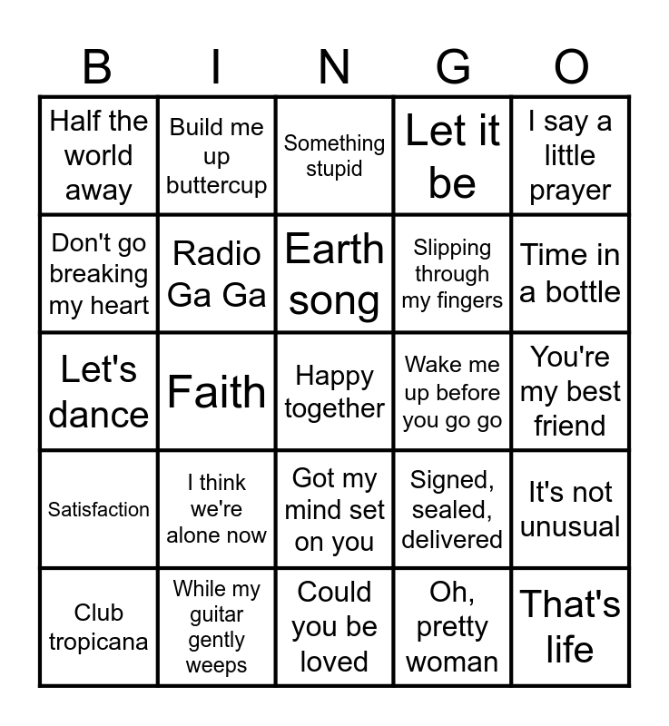 This bingo card has 35 words: Everybody loves somebody, I have a dream, Strangers in the night, Radio Ga Ga, Got my mind set on you, Let it be, Don't go breaking my heart, Tiny dancer, Earth song, Does your mother know, Let's dance, I say a little prayer, Purple rain, When I'm sixty four, Half the world away, Wake me up before you go go, Oh, pretty woman, Faith, Satisfaction, Happy together, Signed, sealed, delivered, Club tropicana, It's not unusual, While my guitar gently weeps, Something stupid, Time in a bottle, That's life, Your song, Slipping through my fingers, You're my best friend, Summer nights, Could you be loved, I think we're alone now, Build me up buttercup and Girls and boys.