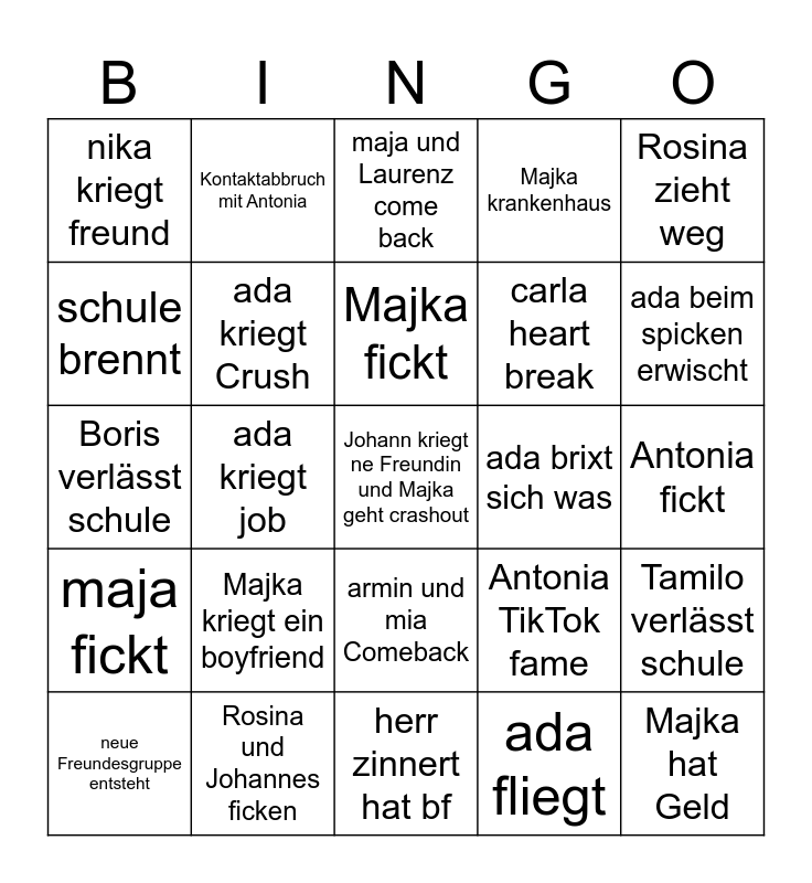 This bingo card has a free space and 24 words: Majka kriegt ein boyfriend, Rosina und Johannes ficken, Majka fickt, neue Freundesgruppe entsteht, Rosina zieht weg, nika kriegt freund, schule brennt, Kontaktabbruch mit Antonia, ada brixt sich was, armin und mia Comeback, carla heart break, Boris verlässt schule, Antonia TikTok fame, Tamilo verlässt schule, ada kriegt Crush, ada fliegt, Antonia fickt, maja und Laurenz come back, ada beim spicken erwischt, ada kriegt job, Majka hat Geld, maja fickt, Majka krankenhaus and herr zinnert hat bf.