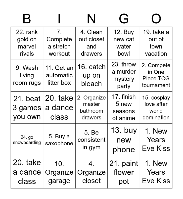 ⚠ This card has duplicate items: 25. get married to the love of my life (2), 7. Complete a stretch workout (2), 11. Get an automatic litter box (2), 1. New Years Eve Kiss (2), 15. cosplay love after world domination (2), 17. finish 5 new seasons of anime (2), 19. take a out of town vacation (2), 20. take a dance class (2), 22. rank gold on marvel rivals (2)
