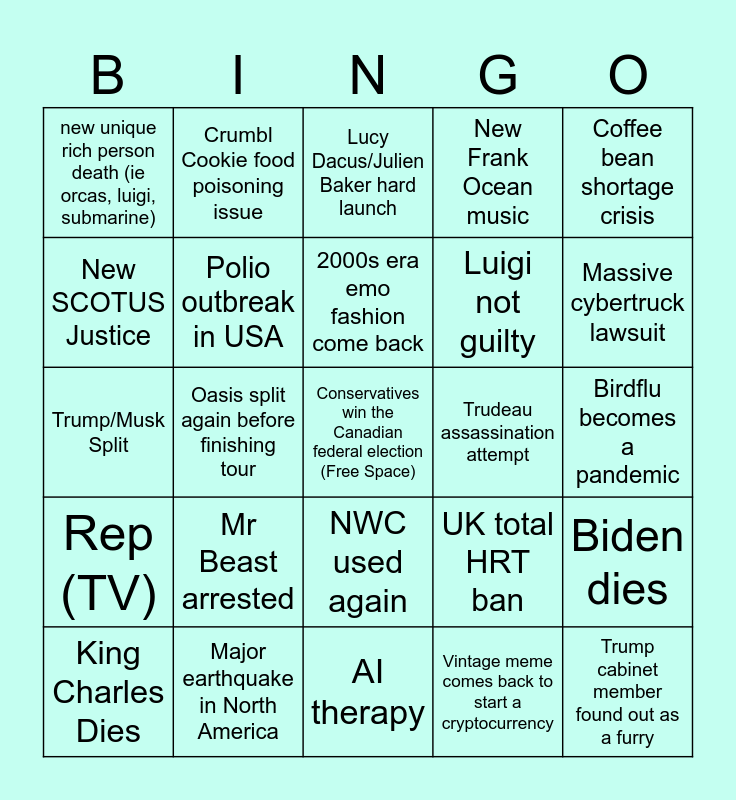 This bingo card has a free space and 24 words: King Charles Dies, Mr Beast arrested, 2000s era emo fashion come back, Vintage meme comes back to start a cryptocurrency, Coffee bean shortage crisis, new unique rich person death (ie orcas, luigi, submarine), Crumbl Cookie food poisoning issue, Lucy Dacus/Julien Baker hard launch, Trudeau assassination attempt, Birdflu becomes a pandemic, Trump/Musk Split, Polio outbreak in USA, UK total HRT ban, Biden dies, New SCOTUS Justice, Major earthquake in North America, AI therapy, New Frank Ocean music, Massive cybertruck lawsuit, Rep (TV), Oasis split again before finishing tour, NWC used again, Luigi not guilty and Trump cabinet member found out as a furry.