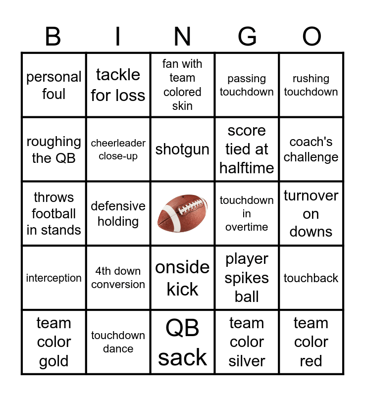 This bingo card has a free space and 43 words: team color black, team color red, team color blue, team color gold, team color green, team color silver, fan with team colored skin, fan with team colored hair, rushing touchdown, touchdown dance, passing touchdown, touchdown in overtime, onside kick, 4th down conversion, pass interference, QB sack, fair catch, throws football in stands, two-point conversion, coach's challenge, tackle for loss, false start, illegal block, personal foul, turnover, turnover on downs, someone on sideline knocked down, missed field goal, player spikes ball, interception, handoff, touchback, offensive holding, defensive holding, fumble, safety, injury timeout, shotgun, roughing the QB, score tied at halftime, field goal, cheerleader close-up and overtime.