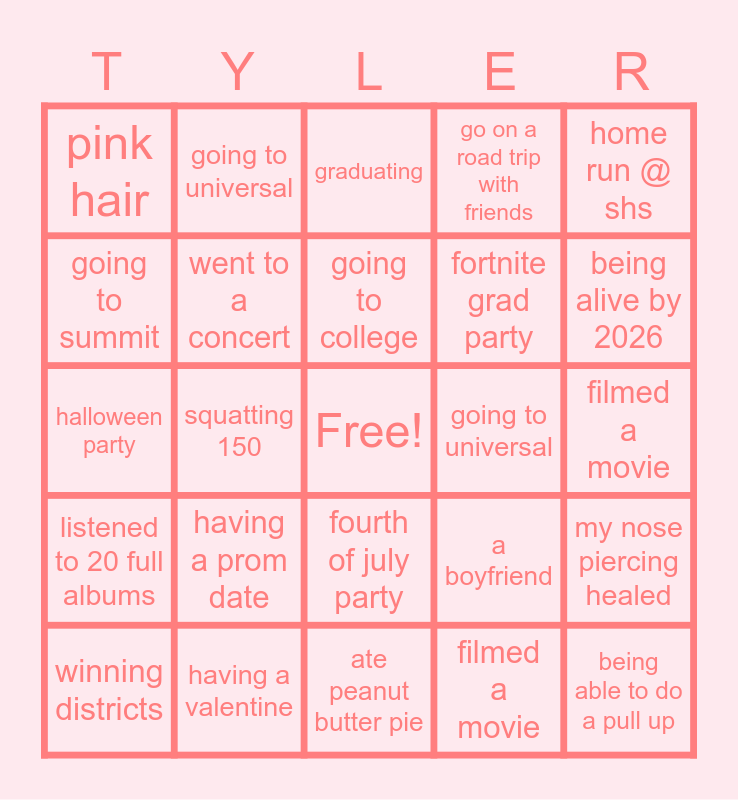 This bingo card has a free space and 24 words: having a prom date, having a valentine, going to college, winning districts, home run @ shs, pink hair, going to summit, going to universal, going to universal, fourth of july party, fortnite grad party, halloween party, a boyfriend, my nose piercing healed, went to a concert, filmed a movie, filmed a movie, graduating, being alive by 2026, squatting 150, being able to do a pull up, listened to 20 full albums, go on a road trip with friends and ate peanut butter pie.