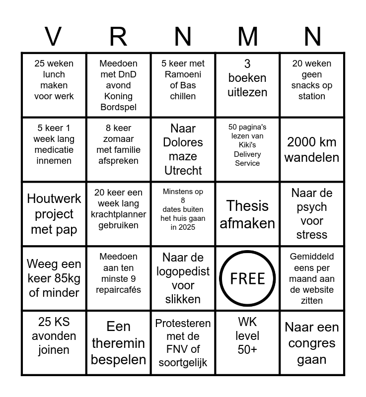 This bingo card has 1 images and 24 words: Meedoen aan ten minste 9 repaircafés, Protesteren met de FNV of soortgelijk, Naar Dolores maze Utrecht, 25 KS avonden joinen, 20 weken geen snacks op station, 25 weken lunch maken voor werk, 5 keer 1 week lang medicatie innemen, Meedoen met DnD avond Koning Bordspel, Thesis afmaken, Naar de logopedist voor slikken, 50 pagina's lezen van Kiki's Delivery Service, Houtwerk project met pap, Gemiddeld eens per maand aan de website zitten, 8 keer zomaar met familie afspreken, Naar een congres gaan, Naar de psych voor stress, 5 keer met Ramoeni of Bas chillen, 2000 km wandelen, 20 keer een week lang krachtplanner gebruiken, Minstens op 8 dates buiten het huis gaan in 2025, Een theremin bespelen, Weeg een keer 85kg of minder, 3 boeken uitlezen and WK level 50+.