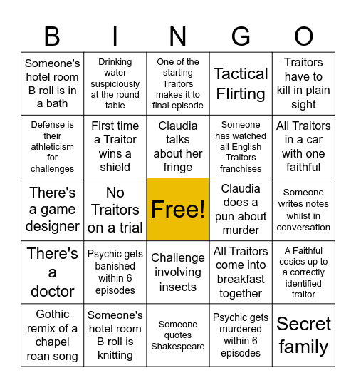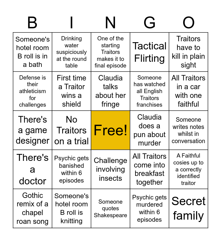 This bingo card has a free space and 53 words: Secret relationship, Secret family, Lies about their job/career, Psychic gets murdered within 6 episodes, Psychic gets banished within 6 episodes, First time 100% faithful gets said, Drinking water suspiciously at the round table, Emotional breakdown at round table including tears, Defense is their athleticism for challenges, Shield blocks a murder, First time a Traitor wins a shield, Someone refuses to try in a challenge, A Faithful cosies up to a correctly identified traitor, All Traitors come into breakfast together, All Traitors sit next to each other, Gothic remix of a chapel roan song, Claudia talks about her fringe, Claudia does a pun about murder, Dramatic funeral scene, Traitors have to kill in plain sight, No Traitors on a trial, One or more Traitors on a trial, Someone has watched all English Traitors franchises, Someone's hotel room B roll is in a bath, Someone's hotel room B roll is lifting weights, Someone's hotel room B roll is knitting, Contestant wears tartan, A previous contestant returns, There's a dog, All Traitors in a car with one faithful, A traitor schemes against a traitor in a car, A strong Geordie accent, A Scottish person, Someone refers to contestant as a "grand/mother", Someone refers to contestant as a "grand/father", Someone keeps voting for a traitor for 3 weeks even though no one believes them, Tactical Flirting, Someone quotes Shakespeare, One of the starting Traitors makes it to final episode, Banish Traitors 2 episodes in a row, A refusal for traitor seduction, A refusal for traitor blackmail, Someone writes notes whilst in conversation, Traitors recruit a disposable traitor as bait, Creepy carnival themed challenge, Challenge involving insects, Upset about being voted least trustworthy, Upset about being voted as a sheep, There's a game designer, There's a doctor, There's a model, There's a farmer and Challenge in the church.