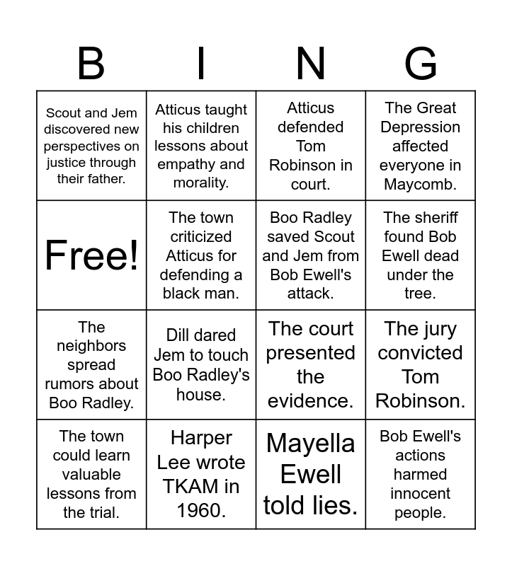 This bingo card has 16 words: Harper Lee wrote TKAM in 1960., The jury convicted Tom Robinson., Atticus defended Tom Robinson in court., Scout and Jem discovered new perspectives on justice through their father., The neighbors spread rumors about Boo Radley., Atticus taught his children lessons about empathy and morality., The court presented the evidence., Mayella Ewell told lies., Free!, The town criticized Atticus for defending a black man., The town could learn valuable lessons from the trial., The Great Depression affected everyone in Maycomb., Dill dared Jem to touch Boo Radley's house., The sheriff found Bob Ewell dead under the tree., Boo Radley saved Scout and Jem from Bob Ewell's attack. and Bob Ewell's actions harmed innocent people..