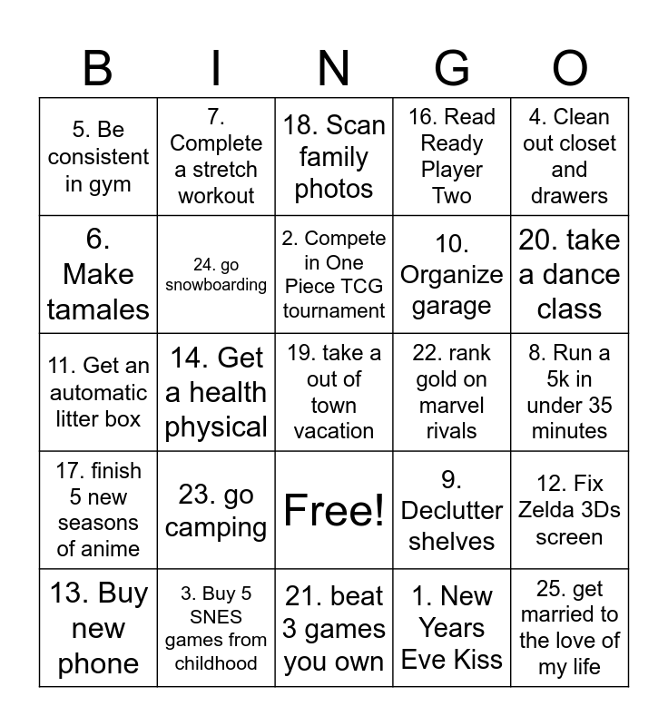 This bingo card has 26 words: Free!, 1. New Years Eve Kiss, 2. Compete in One Piece TCG tournament, 3. Buy 5 SNES games from childhood, 4. Clean out closet and drawers, 5. Be consistent in gym, 6. Make tamales, 7. Complete a stretch workout, 8. Run a 5k in under 35 minutes, 9. Declutter shelves, 10. Organize garage, 11. Get an automatic litter box, 12. Fix Zelda 3Ds screen, 13. Buy new phone, 14. Get a health physical, 15. cosplay love after world domination, 16. Read Ready Player Two, 17. finish 5 new seasons of anime, 18. Scan family photos, 19. take a out of town vacation, 20. take a dance class, 21. beat 3 games you own, 22. rank gold on marvel rivals, 23. go camping, 24. go snowboarding and 25. get married to the love of my life.