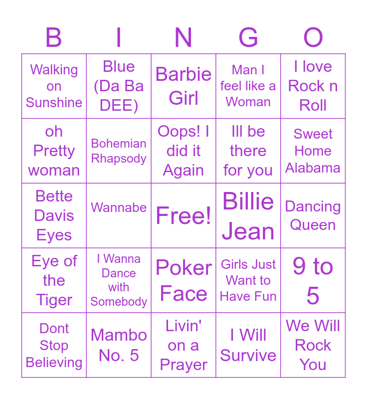 This bingo card has a free space and 29 words: Dont Stop Believing, sweet dreams, Wannabe, Heaven on Earth, Walking on Sunshine, Barbie Girl, Bohemian Rhapsody, I Wanna Dance with Somebody, Billie Jean, Mambo No. 5, Dancing Queen, We Will Rock You, Livin' on a Prayer, I Will Survive, Sweet Home Alabama, Sweet Caroline, Poker Face, Eye of the Tiger, I love Rock n Roll, Bette Davis Eyes, Girls Just Want to Have Fun, Happy, Ill be there for you, oh Pretty woman, Man I feel like a Woman, Blue (Da Ba DEE), 9 to 5, Oops! I did it Again and Wrecking Ball.