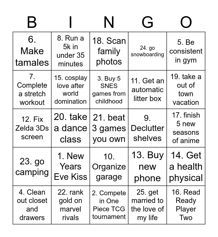 This bingo card has 25 words: 1. New Years Eve Kiss, 2. Compete in One Piece TCG tournament, 3. Buy 5 SNES games from childhood, 4. Clean out closet and drawers, 5. Be consistent in gym, 6. Make tamales, 7. Complete a stretch workout, 8. Run a 5k in under 35 minutes, 9. Declutter shelves, 10. Organize garage, 11. Get an automatic litter box, 12. Fix Zelda 3Ds screen, 13. Buy new phone, 14. Get a health physical, 15. cosplay love after world domination, 16. Read Ready Player Two, 17. finish 5 new seasons of anime, 18. Scan family photos, 19. take a out of town vacation, 20. take a dance class, 21. beat 3 games you own, 22. rank gold on marvel rivals, 23. go camping, 24. go snowboarding and 25. get married to the love of my life.
