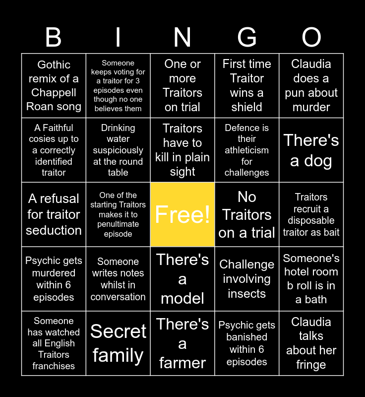 This bingo card has a free space and 60 words: Secret relationship, Secret family, Lies about their job/career, Psychic gets murdered within 6 episodes, Psychic gets banished within 6 episodes, first time 100% faithful is said, Drinking water suspiciously at the round table, Emotional breakdown at round table including tears, Defence is their athleticism for challenges, Shield blocks a murder, First time Traitor wins a shield, Someone refuses to try in a challenge, A Faithful cosies up to a correctly identified traitor, All Traitors come into breakfast together, All Traitors sit next to each other at breakfast, Gothic remix of a Chappell Roan song, Claudia talks about her fringe, Claudia does a pun about murder, Dramatic funeral scene, Traitors have to kill in plain sight, No Traitors on a trial, One or more Traitors on trial, Someone has watched all English Traitors franchises, Someone's hotel room b roll is in a bath, Someone's hotel room b roll is lifting weights, Someone's hotel room b roll is knitting, Someone wears tartan (not Claudia), A previous contestant returns, There's a dog, All Traitors in a car with one faithful, A traitor schemes against a traitor in a car, A strong Georgie accent, Someone refers to contestant as a "grand/mother", Someone refers to contestant as a "grand/father", Someone keeps voting for a traitor for 3 episodes even though no one believes them, Tactical Flirting, Someone quotes Shakespeare, One of the starting Traitors makes it to penultimate episode, Banish Traitors 2 episodes in a row, A refusal for traitor seduction, A refusal for traitor blackmail, Someone writes notes whilst in conversation, Traitors recruit a disposable traitor as bait, Creepy carnival themed challenge, Challenge involving insects, Upset about being voted least trustworthy, Upset about being voted as a sheep, There's a game designer, There's a doctor, There's a model, There's a farmer, Challenge in a Church, Someone abandons team task to get a shield, Name slate with a heart, Name slate misspelled, "You'll waste your vote voting for me", "We need to look at the quiet people", Failure at challenge leads to their banishment, Traitor accidently reveals secret info and Accusation at round table of contestants knowing each other.