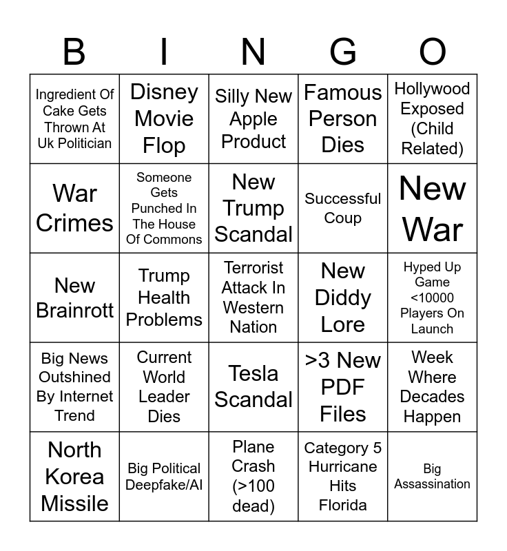 This bingo card has a free space and 24 words: Current World Leader Dies, Big Political Deepfake/AI, New Trump Scandal, North Korea Missile, Hollywood Exposed (Child Related), Ingredient Of Cake Gets Thrown At Uk Politician, War Crimes, Disney Movie Flop, New Diddy Lore, Tesla Scandal, Successful Coup, New Brainrott, >3 New PDF Files, Week Where Decades Happen, Someone Gets Punched In The House Of Commons, Category 5 Hurricane Hits Florida, Hyped Up Game <10000 Players On Launch, Silly New Apple Product, New War, Trump Health Problems, Big Assassination, Big News Outshined By Internet Trend, Famous Person Dies and Plane Crash (>100 dead).