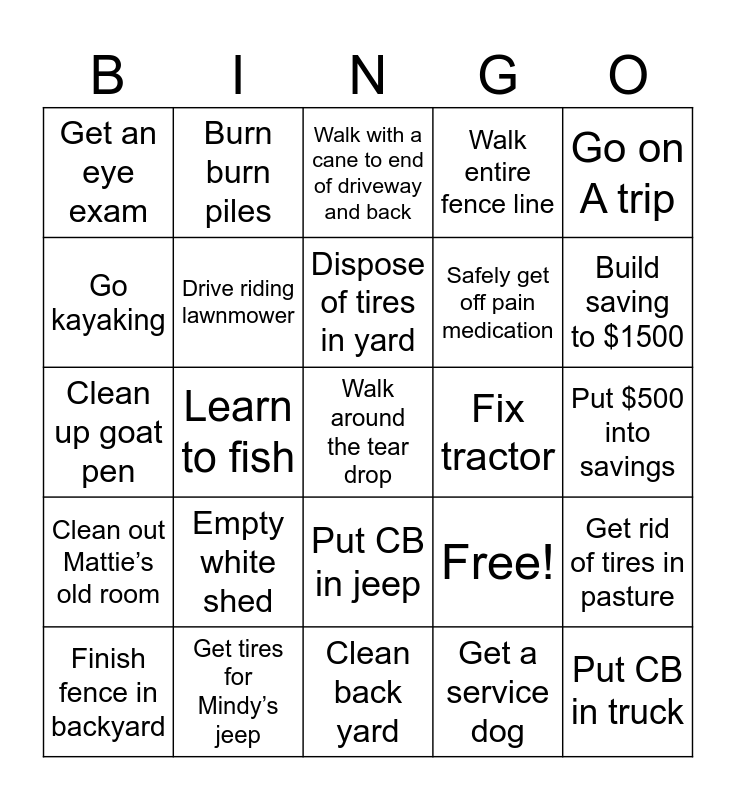 This bingo card has 25 words: Empty white shed, Clean back yard, Dispose of tires in yard, Finish fence in backyard, Go on A trip, Get an eye exam, Go kayaking, Burn burn piles, Fix tractor, Put CB in jeep, Safely get off pain medication, Clean up goat pen, Free!, Get rid of tires in pasture, Drive riding lawnmower, Put CB in truck, Put $500 into savings, Walk with a cane to end of driveway and back, Build saving to $1500, Learn to fish, Walk around the tear drop, Get tires for Mindy’s jeep, Clean out Mattie’s old room, Walk entire fence line and Get a service dog.