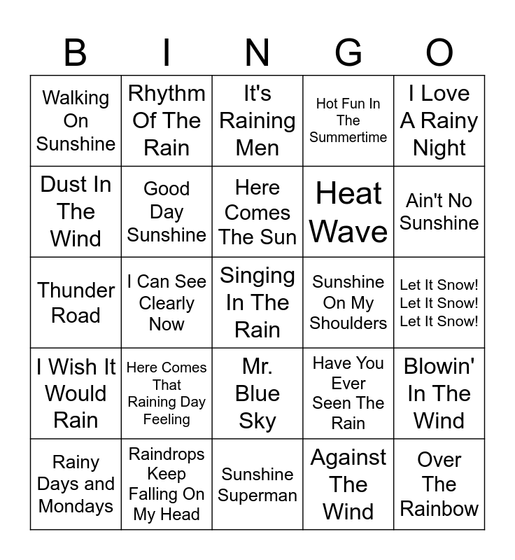 This bingo card has a free space and 24 words: Here Comes That Raining Day Feeling, Raindrops Keep Falling On My Head, Here Comes The Sun, Rainy Days and Mondays, I Love A Rainy Night, Walking On Sunshine, Dust In The Wind, Rhythm Of The Rain, Sunshine On My Shoulders, Mr. Blue Sky, Heat Wave, Thunder Road, Have You Ever Seen The Rain, Blowin' In The Wind, Good Day Sunshine, Against The Wind, Let It Snow! Let It Snow! Let It Snow!, It's Raining Men, Ain't No Sunshine, I Can See Clearly Now, Over The Rainbow, I Wish It Would Rain, Hot Fun In The Summertime and Sunshine Superman.