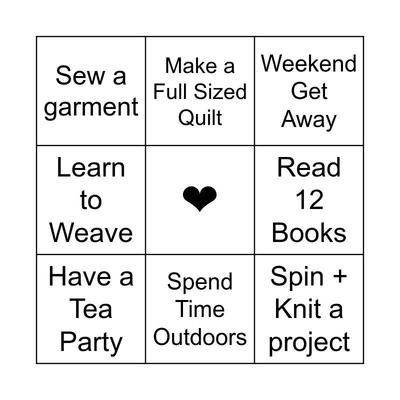 This bingo card has a free space and 8 words: Read 12 Books, Weekend Get Away, Make a Full Sized Quilt, Have a Tea Party, Sew a garment, Spin + Knit a project, Learn to Weave and Spend Time Outdoors.
