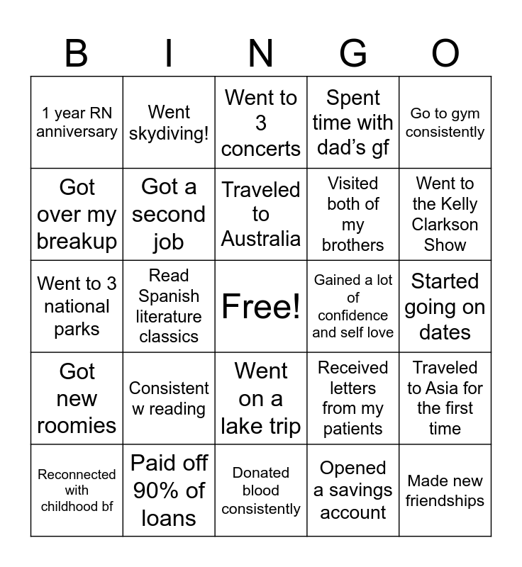 This bingo card has a free space and 24 words: Consistent w reading, Paid off 90% of loans, Traveled to Australia, Reconnected with childhood bf, Go to gym consistently, 1 year RN anniversary, Got over my breakup, Went skydiving!, Gained a lot of confidence and self love, Went on a lake trip, Visited both of my brothers, Went to 3 national parks, Received letters from my patients, Traveled to Asia for the first time, Got a second job, Opened a savings account, Started going on dates, Went to 3 concerts, Went to the Kelly Clarkson Show, Read Spanish literature classics, Made new friendships, Got new roomies, Spent time with dad’s gf and Donated blood consistently.