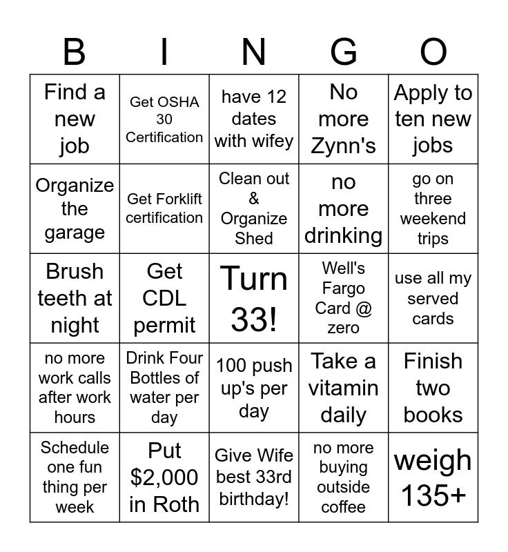 This bingo card has a free space and 24 words: Drink Four Bottles of water per day, Put $2,000 in Roth, Clean out & Organize Shed, Schedule one fun thing per week, Apply to ten new jobs, Find a new job, Organize the garage, Get OSHA 30 Certification, Well's Fargo Card @ zero, 100 push up's per day, no more drinking, Brush teeth at night, Take a vitamin daily, Finish two books, Get Forklift certification, no more buying outside coffee, use all my served cards, have 12 dates with wifey, go on three weekend trips, Get CDL permit, weigh 135+, no more work calls after work hours, No more Zynn's and Give Wife best 33rd birthday!.