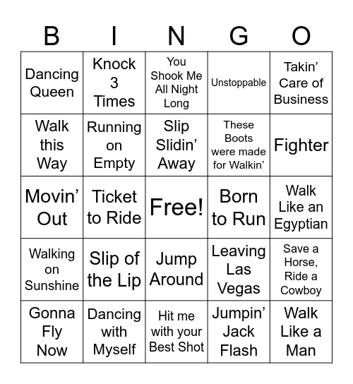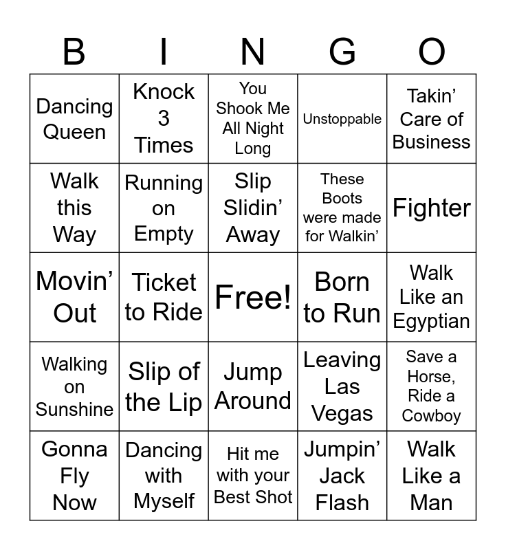 This bingo card has a free space and 38 words: Push, Push It, Rock with YouDon’t Rock the Jukebox, Running on Empty, Save a Horse, Ride a Cowboy, Slip of the Lip, Slip Slidin’ Away, Take the Money & Run, Takin’ Care of Business, These Boots were made for Walkin’, Ticket to Ride, Unstoppable, Walk Like a Man, Walk Like an Egyptian, Walk this Way, Walking on Sunshine, Walkin’ on the Sun, You Shook Me All Night Long, Beat It, Born to Run, Dancing Queen, Dancing with Myself, Fighter, Gonna Fly Now, Hit Me Baby One More Time, Hit me with your Best Shot, Hit the Road Jack, I Shot the Sheriff, I Walk the Line, Jump (Van Halen), Jump (Kris Kross), Jump Around, Jumpin’ Jack Flash, Knock 3 Times, Lay Down Sally, Leaving Las Vegas, Movin’ Out and Only the Good Die Young.