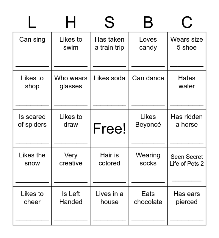 This bingo card has a free space and 49 words: Have Brown Eyes _________, Has ears pierced _________, Has siblings _________, Lives in a house _________, Very creative _________, Black hair _________, Likes to swim _________, Has a pet _________, Likes to shop _________, Has on something pink _________, Who wears glasses _________, Loves candy _________, Seen Secret Life of Pets 2 _________, Wearing socks _________, Wearing sneakers _________, Watched Disney channel _________, Likes soda _________, Likes Beyoncé _________, Has on bracelets _________, Wears size 5 shoe _________, Likes to draw _________, Eats chocolate _________, Can sing _________, Can dance _________, Doesn’t have ears pierced _________, Hates water _________, Likes to cheer _________, Wears perfume _________, Hair is colored _________, Likes the snow _________, Likes vegetables _________, Has been to Disney World _________, Likes Chinese food _________, Likes to cook _________, Is Left Handed _________, Has lived in another U.S. State _________, Was born in December _________, Knows how to swim _________, Has ridden a horse _________, Goes to church _________, Has broken a bone _________, Drinks coffee _________, Likes to wake up early _________, Can whistle a song _________, Is scared of spiders _________, Has taken a train trip _________, Plays a musical instrument _________, Likes to play soccer _________ and Has lived in another country _________.