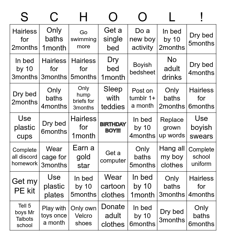 This bingo card has a free space and 48 words: In bed by 10 1month, No adult drinks, Donate adult clothes, Dry bed 6months, Only hump briefs for 3months, Use boyish swears, Only baths 1month, Play with toys once a month, In bed by 10 2months, Get a computer, Dry bed 5months, Get a single bed, Only baths 2months, Post on tumblr 1+ a month, Get my PE kit, Replace grown up words, In bed by 10 3months, Dry bed 4months, Only baths 3months, Do a new boy activity, Boyish bedsheet, Hairless for 1month, Hairless for 2months, Hairless for 3months, Hairless for 4months, Hairless for 5months, Hairless for 6months, Tell 5 boys Mr Talbots school, Sleep with teddies, Only baths 4months, Dry bed 3months, In bed by 10 4months, Complete school uniform, Use plastic plates, Use plastic cups, Only baths 5months, Hang all my boy clothes, Dry bed 2months, Earn a gold star, In bed by 10 5months, Complete all discord homework, Only baths 6months, Go swimming more, Only own Velcro shoes, Dry bed 1month, Wear cartoon clothes, Wear cage for 3months and In bed by 10 6months.