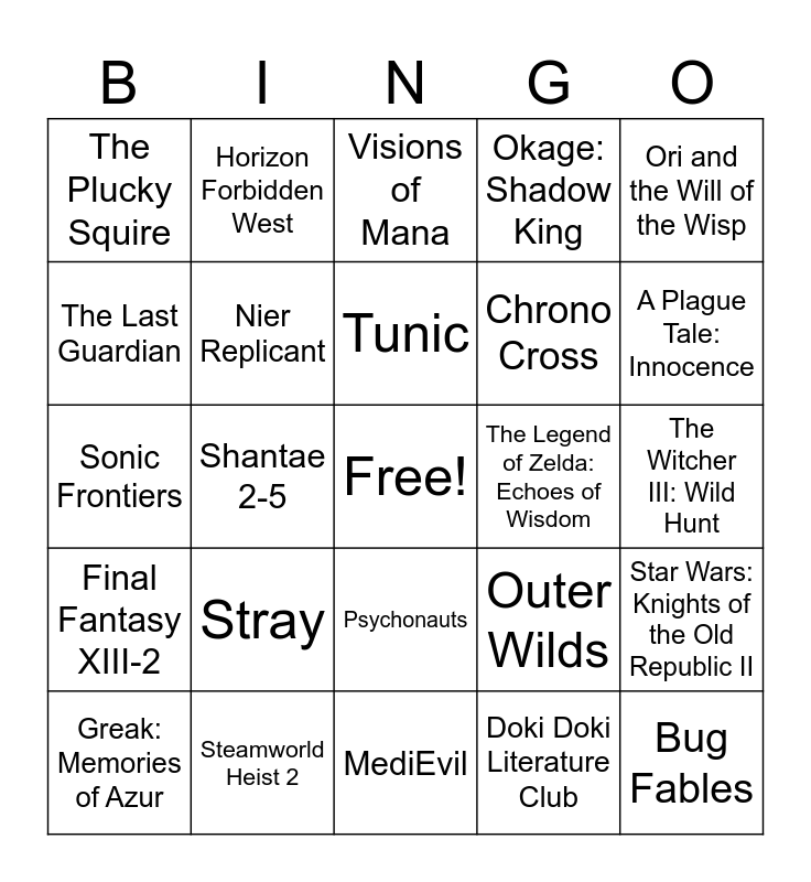 This bingo card has a free space and 24 words: Stray, Steamworld Heist 2, Tunic, Greak: Memories of Azur, Ori and the Will of the Wisp, The Plucky Squire, The Last Guardian, Horizon Forbidden West, The Legend of Zelda: Echoes of Wisdom, Psychonauts, Chrono Cross, Sonic Frontiers, Outer Wilds, Star Wars: Knights of the Old Republic II, Nier Replicant, Doki Doki Literature Club, The Witcher III: Wild Hunt, Visions of Mana, A Plague Tale: Innocence, Shantae 2-5, Bug Fables, Final Fantasy XIII-2, Okage: Shadow King and MediEvil.
