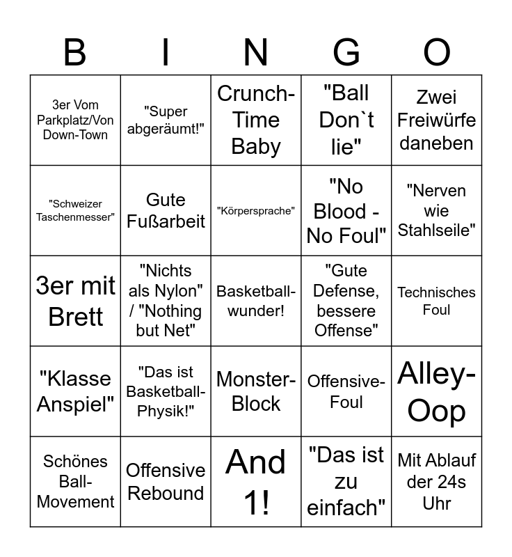 This bingo card has a free space and 24 words: "Das ist Basketball-Physik!", Offensive Rebound, "Körpersprache", Schönes Ball-Movement, Zwei Freiwürfe daneben, 3er Vom Parkplatz/Von Down-Town, "Schweizer Taschenmesser", "Super abgeräumt!", "Gute Defense, bessere Offense", Monster-Block, "No Blood - No Foul", 3er mit Brett, Offensive-Foul, Alley- Oop, Gute Fußarbeit, "Das ist zu einfach", Technisches Foul, Crunch-Time Baby, "Nerven wie Stahlseile", "Nichts als Nylon" / "Nothing but Net", Mit Ablauf der 24s Uhr, "Klasse Anspiel", "Ball Don`t lie" and And 1!.
