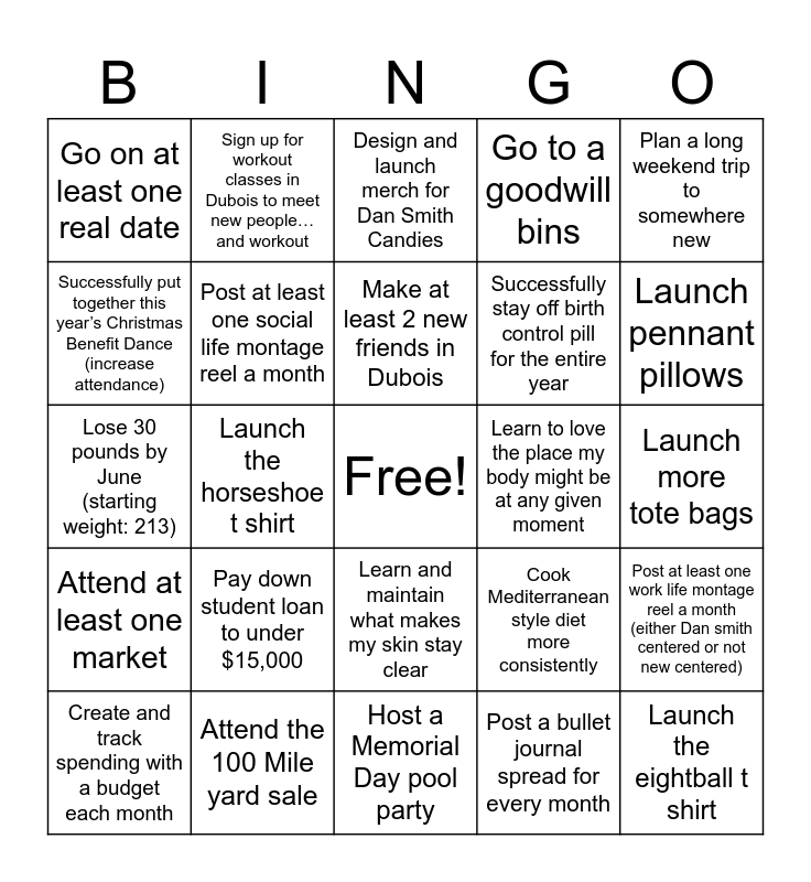 This bingo card has a free space and 24 words: Pay down student loan to under $15,000, Attend the 100 Mile yard sale, Make at least 2 new friends in Dubois, Create and track spending with a budget each month, Plan a long weekend trip to somewhere new, Go on at least one real date, Successfully put together this year’s Christmas Benefit Dance (increase attendance), Sign up for workout classes in Dubois to meet new people… and workout, Learn to love the place my body might be at any given moment, Learn and maintain what makes my skin stay clear, Successfully stay off birth control pill for the entire year, Lose 30 pounds by June (starting weight: 213), Cook Mediterranean style diet more consistently, Post at least one work life montage reel a month (either Dan smith centered or not new centered), Post at least one social life montage reel a month, Post a bullet journal spread for every month, Launch more tote bags, Design and launch merch for Dan Smith Candies, Launch pennant pillows, Launch the horseshoe t shirt, Launch the eightball t shirt, Attend at least one market, Go to a goodwill bins and Host a Memorial Day pool party.
