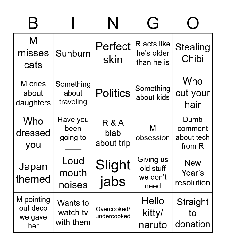 This bingo card has a free space and 24 words: Loud mouth noises, Wants to watch tv with them, Politics, M pointing out deco we gave her, Stealing Chibi, M misses cats, M cries about daughters, Sunburn, M obsession, Slight jabs, Something about kids, Who dressed you, Giving us old stuff we don’t need, New Year’s resolution, Something about traveling, Hello kitty/ naruto, Dumb comment about tech from R, Perfect skin, Who cut your hair, Have you been going to ____, Straight to donation, Japan themed, R acts like he’s older than he is and Overcooked/ undercooked.