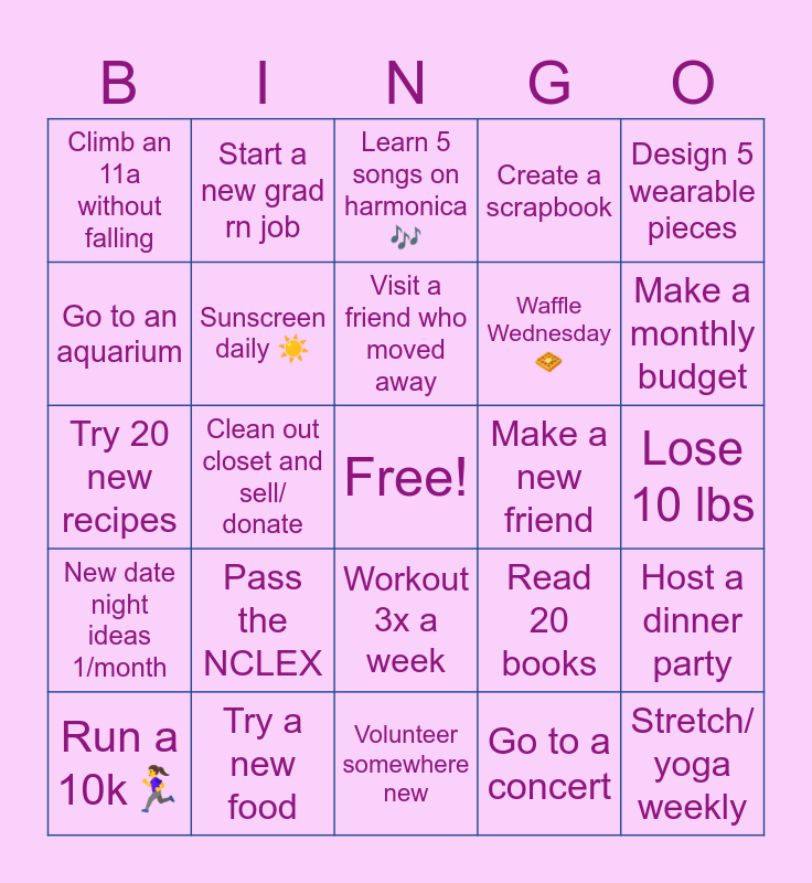 This bingo card has a free space and 24 words: Pass the NCLEX, Try a new food, Visit a friend who moved away, Run a 10kšāāļø, Design 5 wearable pieces, Climb an 11a without falling, Go to an aquarium, Start a new grad rn job, Make a new friend, Workout 3x a week, Waffle Wednesday š§, Try 20 new recipes, Read 20 books, Host a dinner party, Sunscreen daily āļø, Go to a concert, Lose 10 lbs, Learn 5 songs on harmonica š¶, Make a monthly budget, Clean out closet and sell/ donate, Stretch/ yoga weekly, New date night ideas 1/month, Create a scrapbook and Volunteer somewhere new.