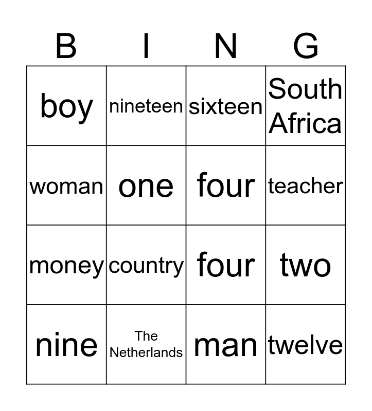 This bingo card has 52 words: world, nine, ten, eleven, seventeen, eighteen, nineteen, twenty, one, three, four, five, six, seven, eight, street, teacher, The Netherlands, count, woman, two, Belgium, boy, money, mum, name, number, child, country, dad, people, South Africa, sheep, year, fifteen, sixteen, email, England, friend, girl, Italy, man, twelve, thirteen, fourteen, America, three, four, five, six, seven and eight.