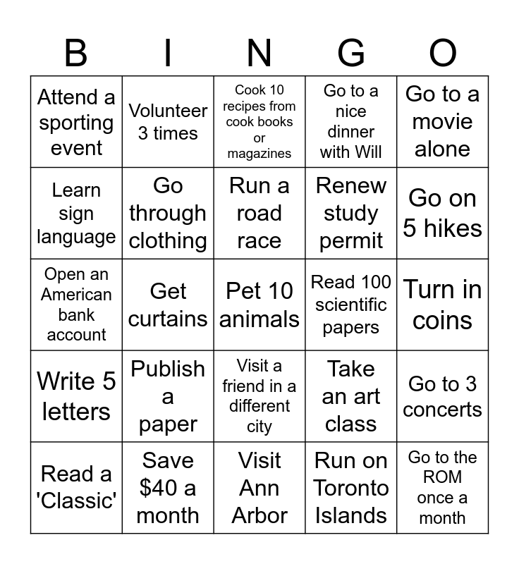 This bingo card has 25 words: Publish a paper, Visit Ann Arbor, Run a road race, Read a 'Classic', Go to a movie alone, Attend a sporting event, Learn sign language, Volunteer 3 times, Read 100 scientific papers, Visit a friend in a different city, Renew study permit, Open an American bank account, Take an art class, Go to 3 concerts, Go through clothing, Go to the ROM once a month, Turn in coins, Cook 10 recipes from cook books or magazines, Go on 5 hikes, Get curtains, Pet 10 animals, Save $40 a month, Write 5 letters, Go to a nice dinner with Will and Run on Toronto Islands.