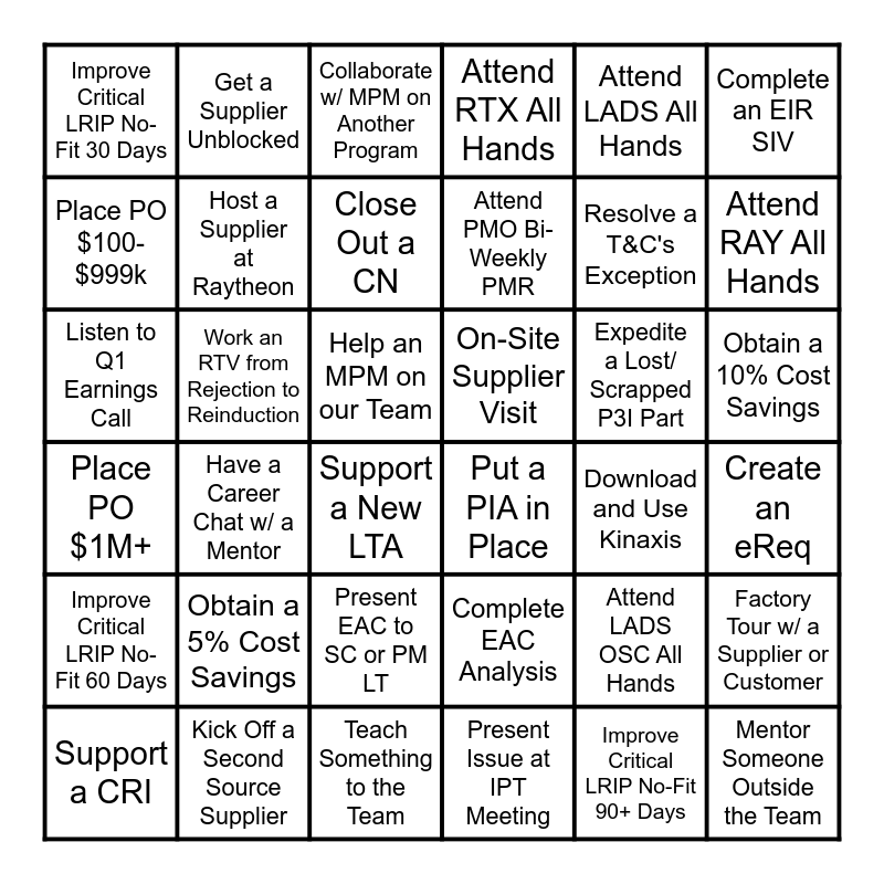 This bingo card has 36 words: Complete EAC Analysis, Present EAC to SC or PM LT, Present Issue at IPT Meeting, Place PO $100- $999k, Place PO $1M+, On-Site Supplier Visit, Host a Supplier at Raytheon, Teach Something to the Team, Attend LADS All Hands, Attend LADS OSC All Hands, Attend RAY All Hands, Attend RTX All Hands, Factory Tour w/ a Supplier or Customer, Work an RTV from Rejection to Reinduction, Attend PMO Bi-Weekly PMR, Improve Critical LRIP No-Fit 30 Days, Improve Critical LRIP No-Fit 60 Days, Expedite a Lost/ Scrapped P3I Part, Listen to Q1 Earnings Call, Collaborate w/ MPM on Another Program, Help an MPM on our Team, Have a Career Chat w/ a Mentor, Put a PIA in Place, Support a New LTA, Download and Use Kinaxis, Get a Supplier Unblocked, Resolve a T&C's Exception, Kick Off a Second Source Supplier, Close Out a CN, Complete an EIR SIV, Mentor Someone Outside the Team, Support a CRI, Create an eReq, Obtain a 10% Cost Savings, Obtain a 5% Cost Savings and Improve Critical LRIP No-Fit 90+ Days.