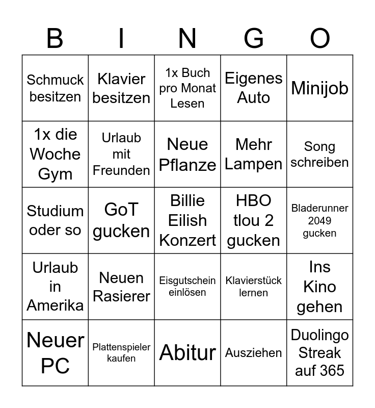 This bingo card has 25 words: Urlaub in Amerika, Plattenspieler kaufen, Billie Eilish Konzert, Ausziehen, Minijob, Schmuck besitzen, Klavier besitzen, 1x Buch pro Monat Lesen, HBO tlou 2 gucken, Ins Kino gehen, 1x die Woche Gym, Urlaub mit Freunden, Abitur, Klavierstück lernen, Song schreiben, Neuer PC, GoT gucken, Neue Pflanze, Mehr Lampen, Bladerunner 2049 gucken, Studium oder so, Neuen Rasierer, Eisgutschein einlösen, Eigenes Auto and Duolingo Streak auf 365.