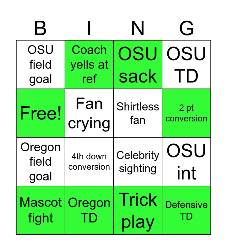 This bingo card has 16 words: Oregon TD, OSU int, OSU sack, OSU field goal, Oregon field goal, Coach yells at ref, Celebrity sighting, Trick play, Free!, Fan crying, Mascot fight, OSU TD, 4th down conversion, 2 pt conversion, Shirtless fan and Defensive TD.